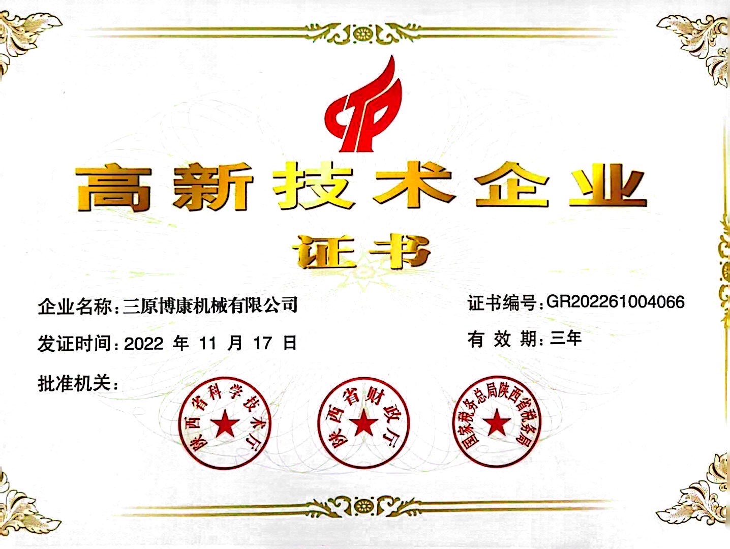 高新技術(shù)企業(yè)證書(shū)